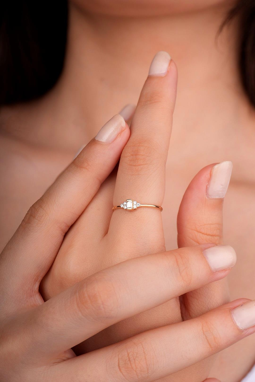 14 Ayar Altın Beyaz Baget Taşlı  Yüzük