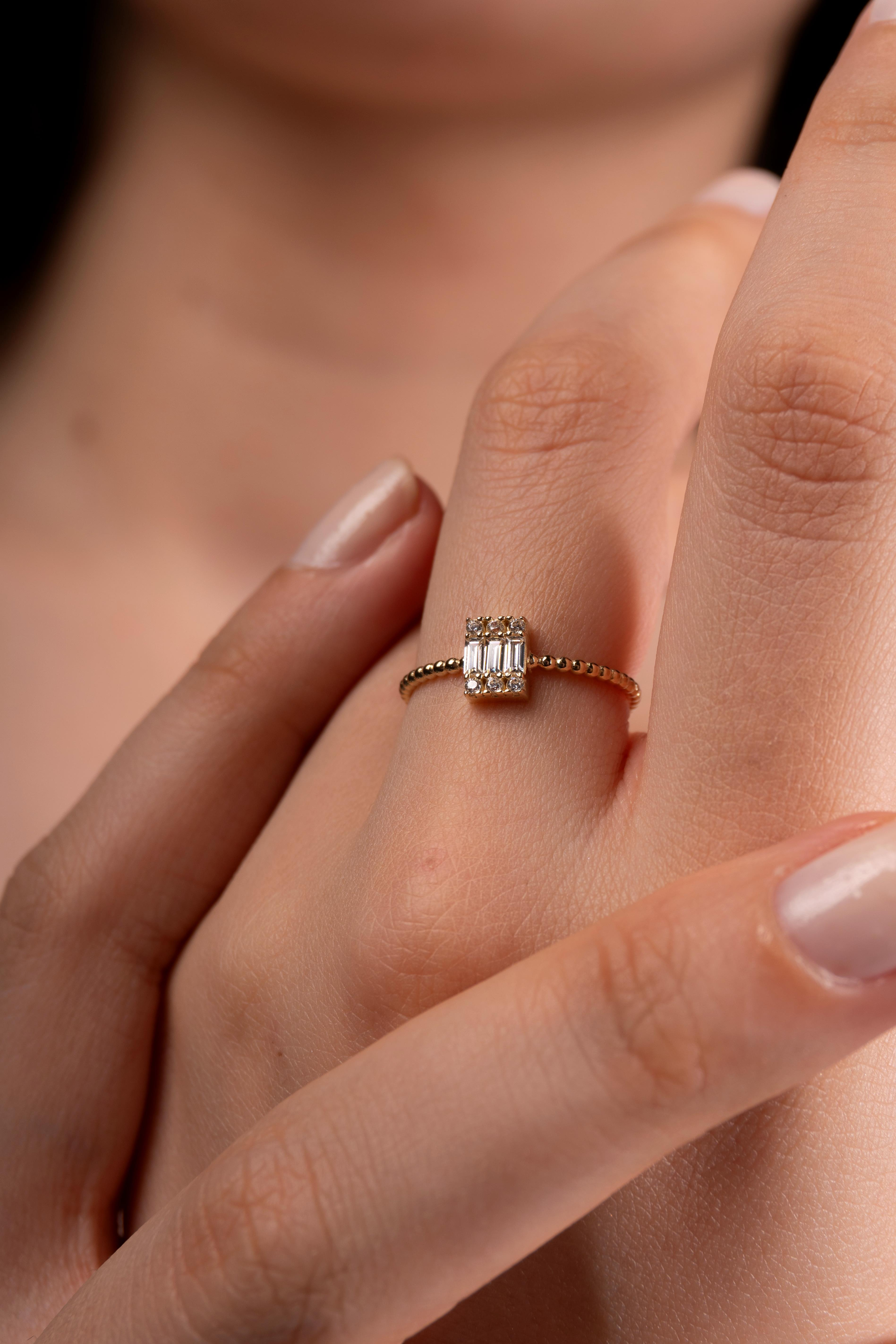 14 Ayar Altın Beyaz Taşlı Desenli Baget Yüzük