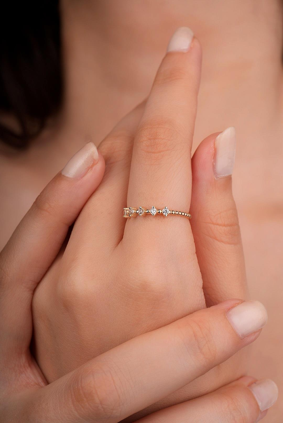 14 Ayar Altın Beyaz Taşlı Desenli Minimal Yüzük
